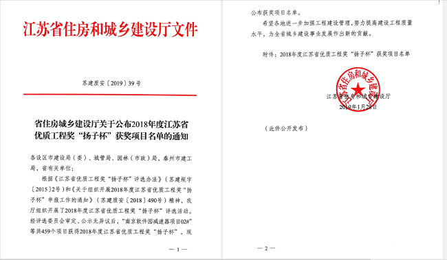 The housing and urban-rural construction department of Jiangsu province, in accordance with the Selection Method of Jiangsu Quality Engineering Award "Yangtze Cup" and the Notice of Organizing and Launching the Declaration of "Yangtze Cup" of Jiangsu Quality Engineering Award in 2018, considered carefully and publicized wothout objection that "North Section of Suzhou Central Expressway" which our company participated in won "Yangtze Cup" of Jiangsu Quality Engineering Award in 2018.